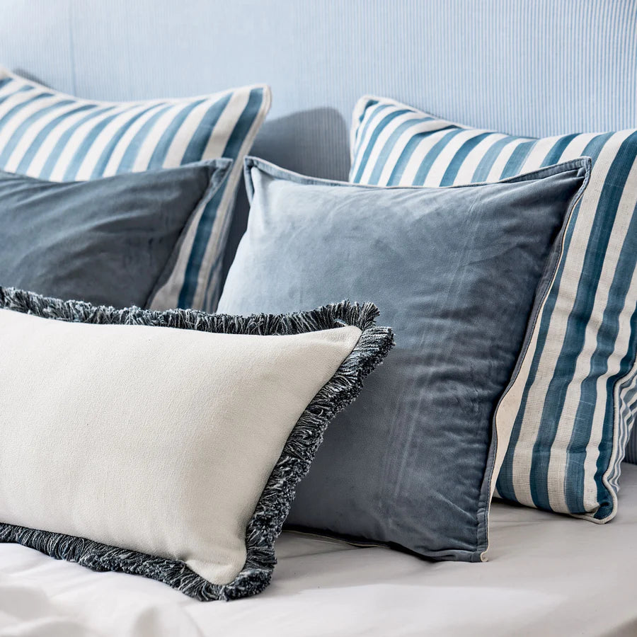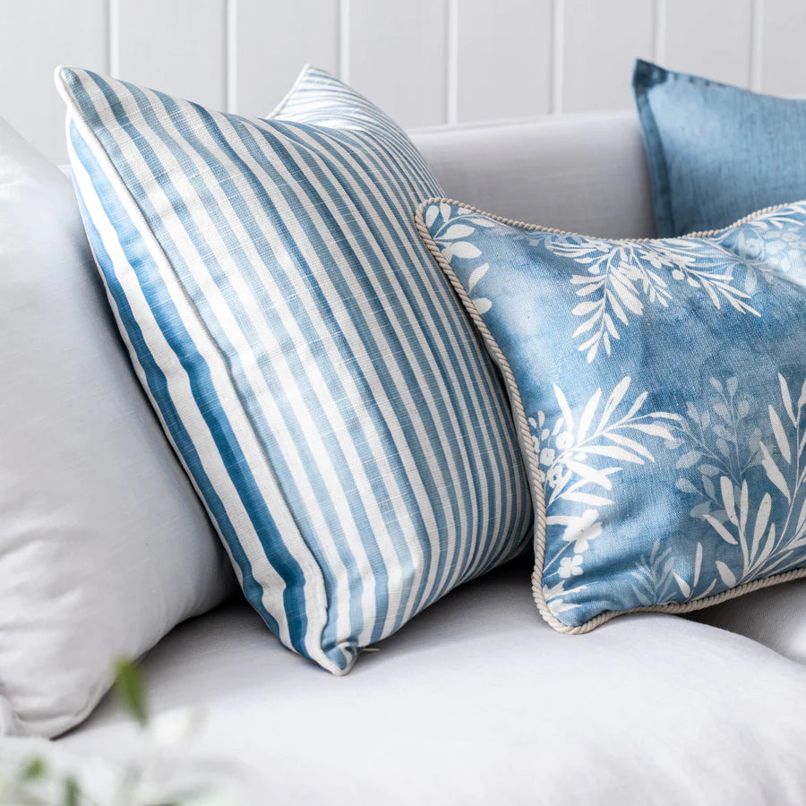 Our Blue Painted Stripe cushion features a vertical, alternating blue and white stripe with a painted finish. Each side features a different width of stripe to create a versatile cushion that can be used in a range of different spaces.