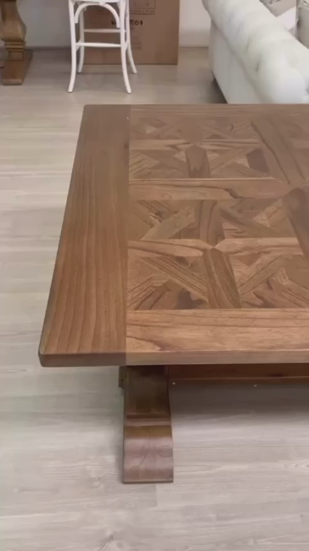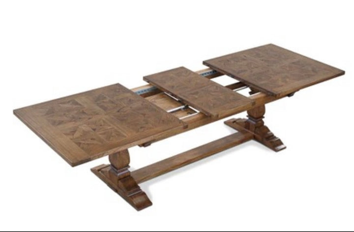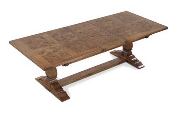 The Nantucket Extension Dining Table features rustic parquetry top with smooth finish and beautiful slim pedestal legs.