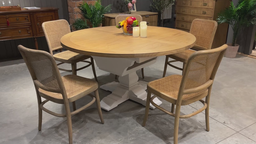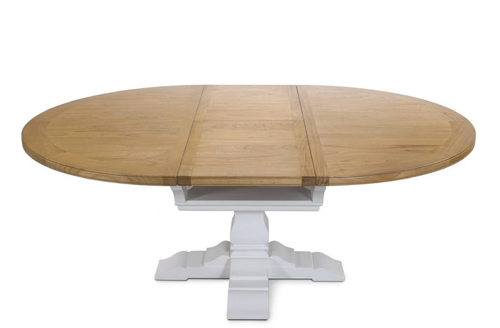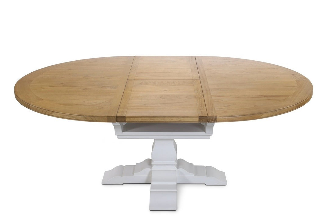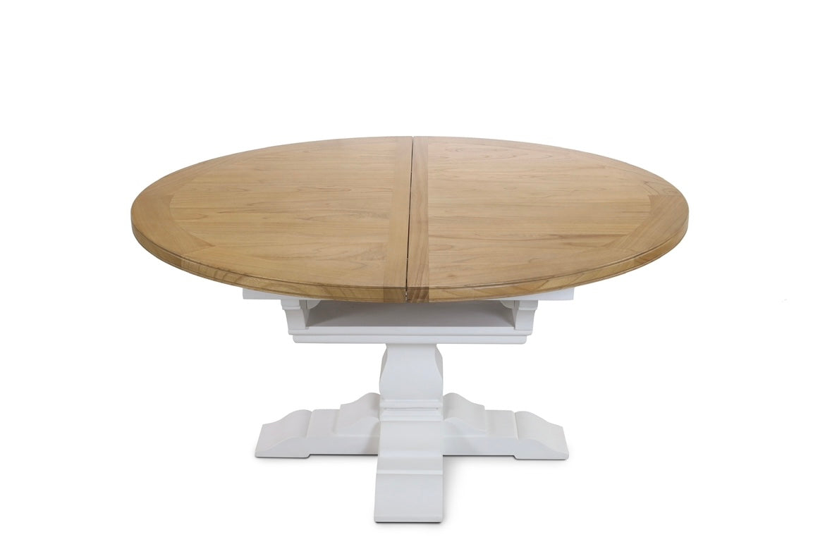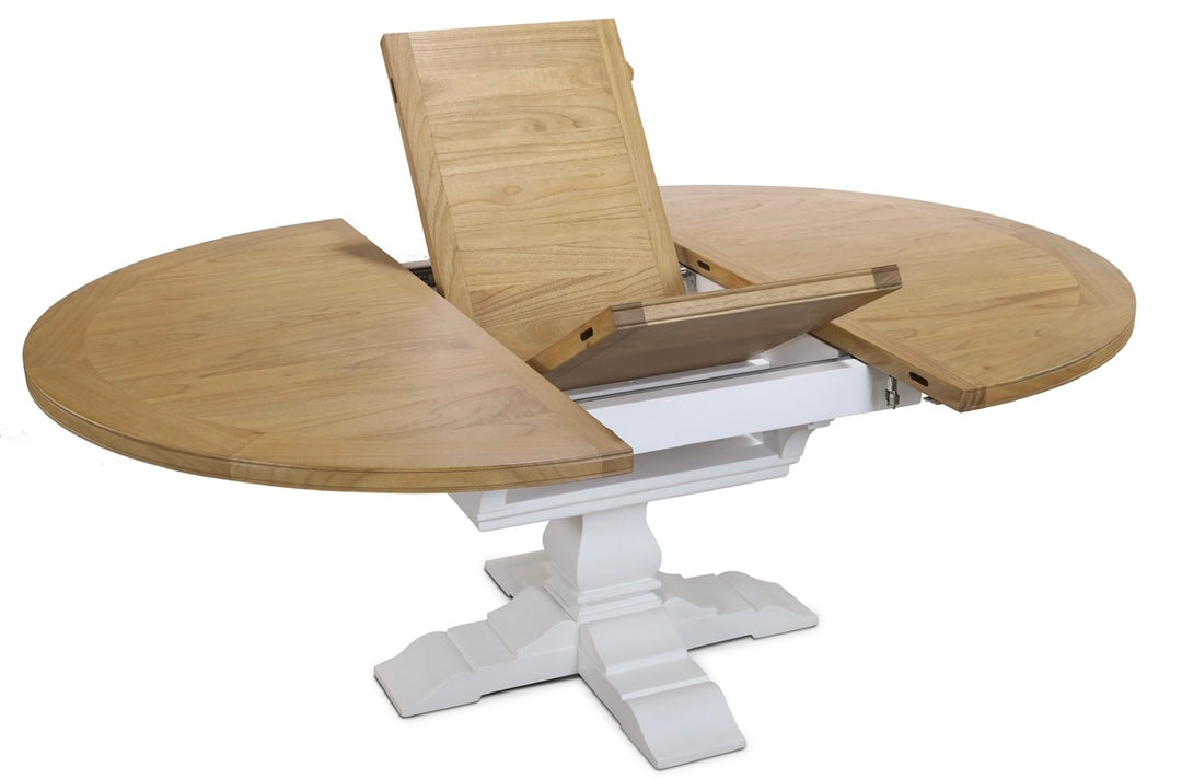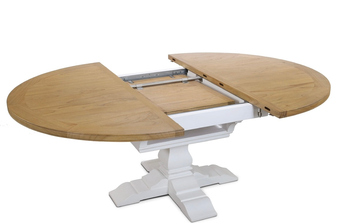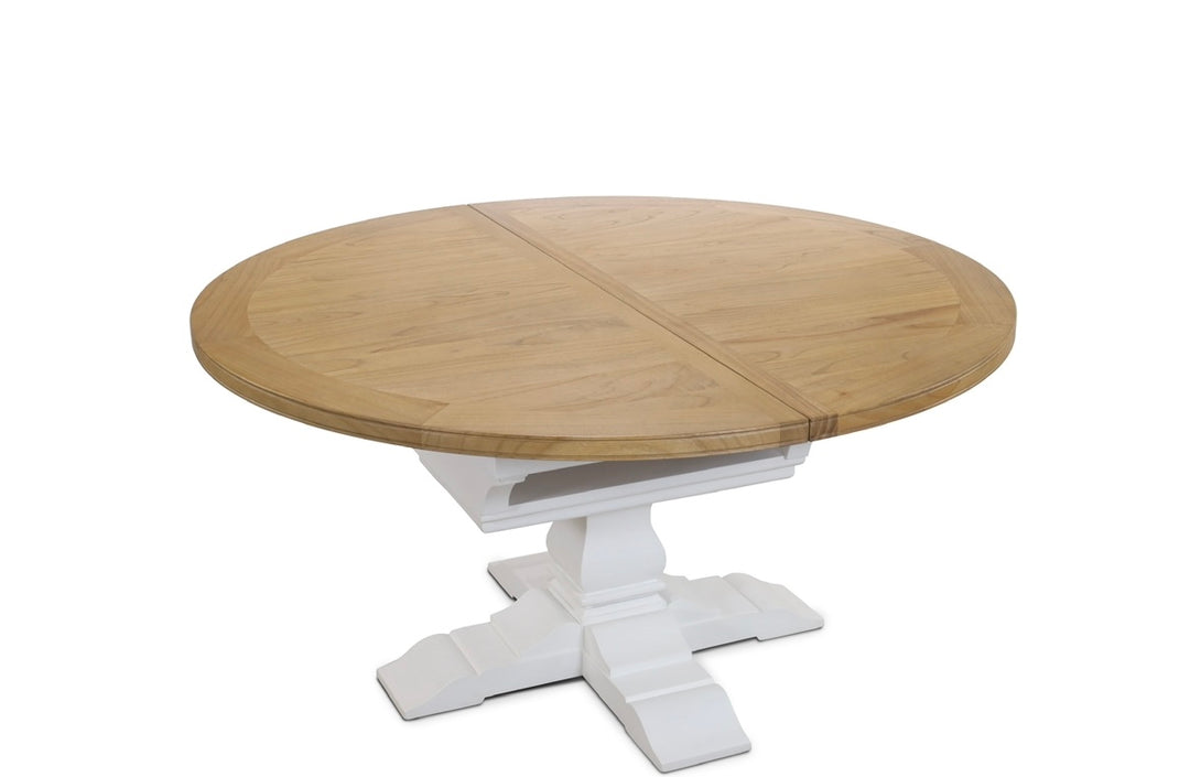 Bring the breezy charm of the coast to your dining space with this coastal-style round extendable dining table. Featuring a beautiful light Beechwood top and classic white pedestal leg, it effortlessly extends from a cozy 110 cm Round to 160cm Oval , perfect for intimate meals or larger gatherings.