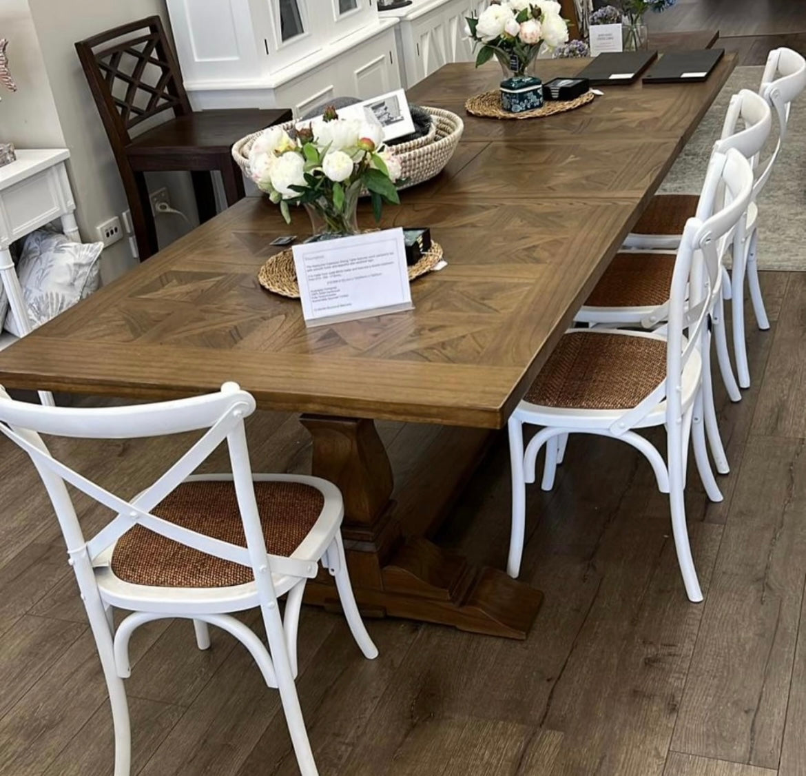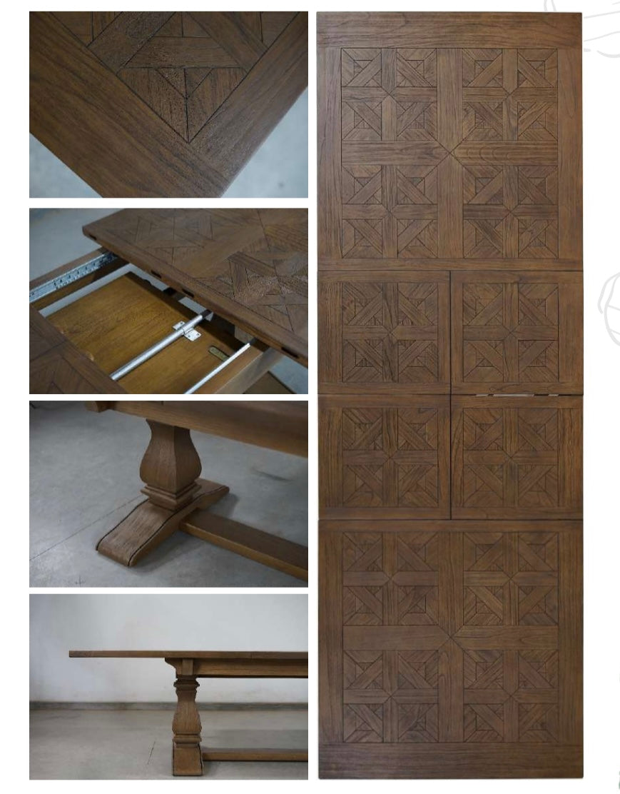 The Nantucket Extension Dining Table features rustic parquetry top with smooth finish and beautiful slim pedestal legs.