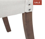 Classic looking is this Lethbridge Dining chair, with maximum comfort. Featuring a Light Grey linen look fabric with silver studs on the back and side. The Lethbridge would suit the Manhattan Apartment, Hamptons & French Country Styles. Antique wood coloured straight legs.