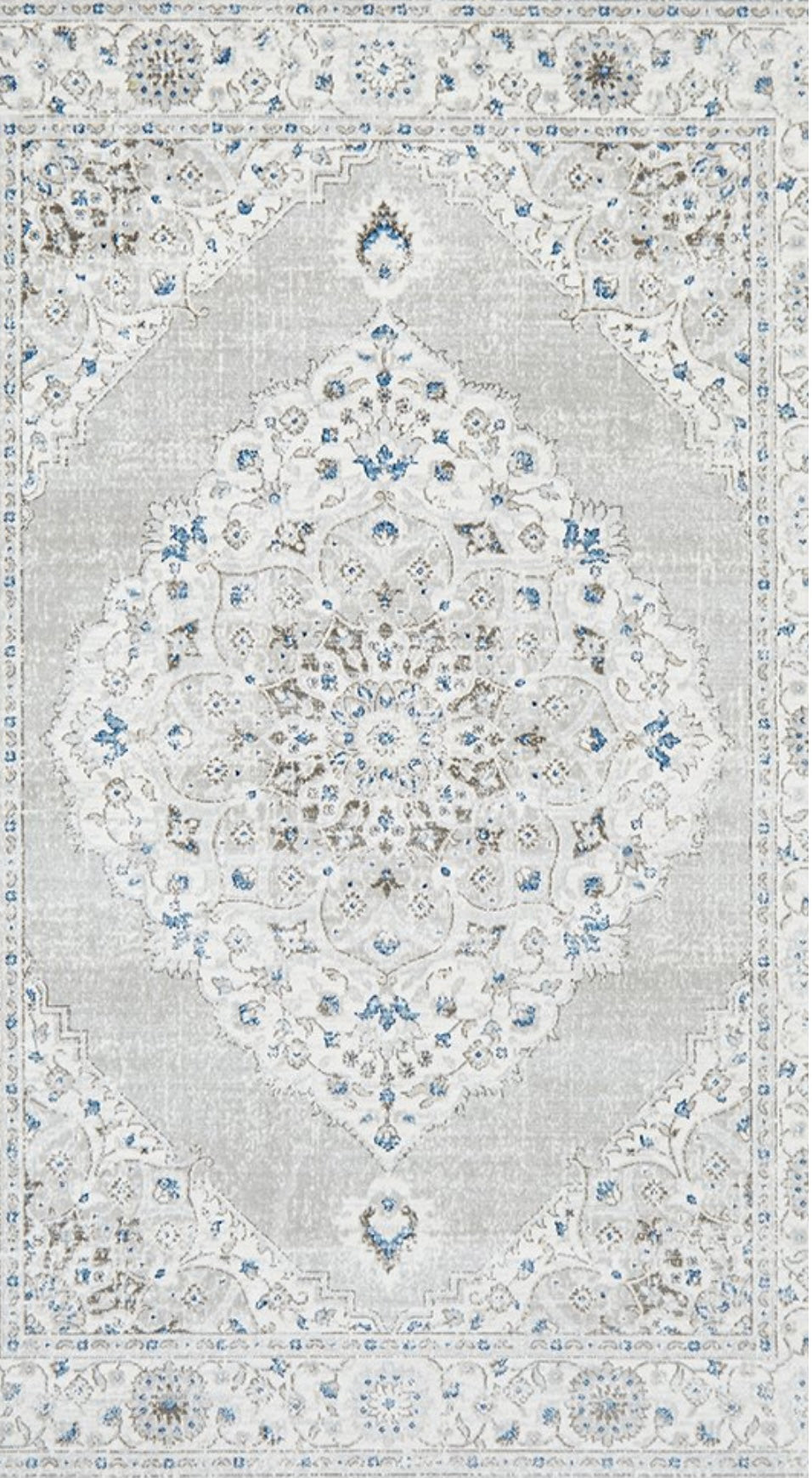 Mayfair is a truly stunning statement rug with it's gorgeous off-white, soft-grey, and cornflower blue hues. Featuring an intricate diamond emblem design and decorative floral arrangements, the Mayfair is a stunning centrepiece that will give any interior a charming bohemian warmth. Woven in Turkey using modern looming techniques, Mayfair is crafted from a 5mm low pile of silky-soft polyester fibres, making it both a durable design and a dream to walk on.