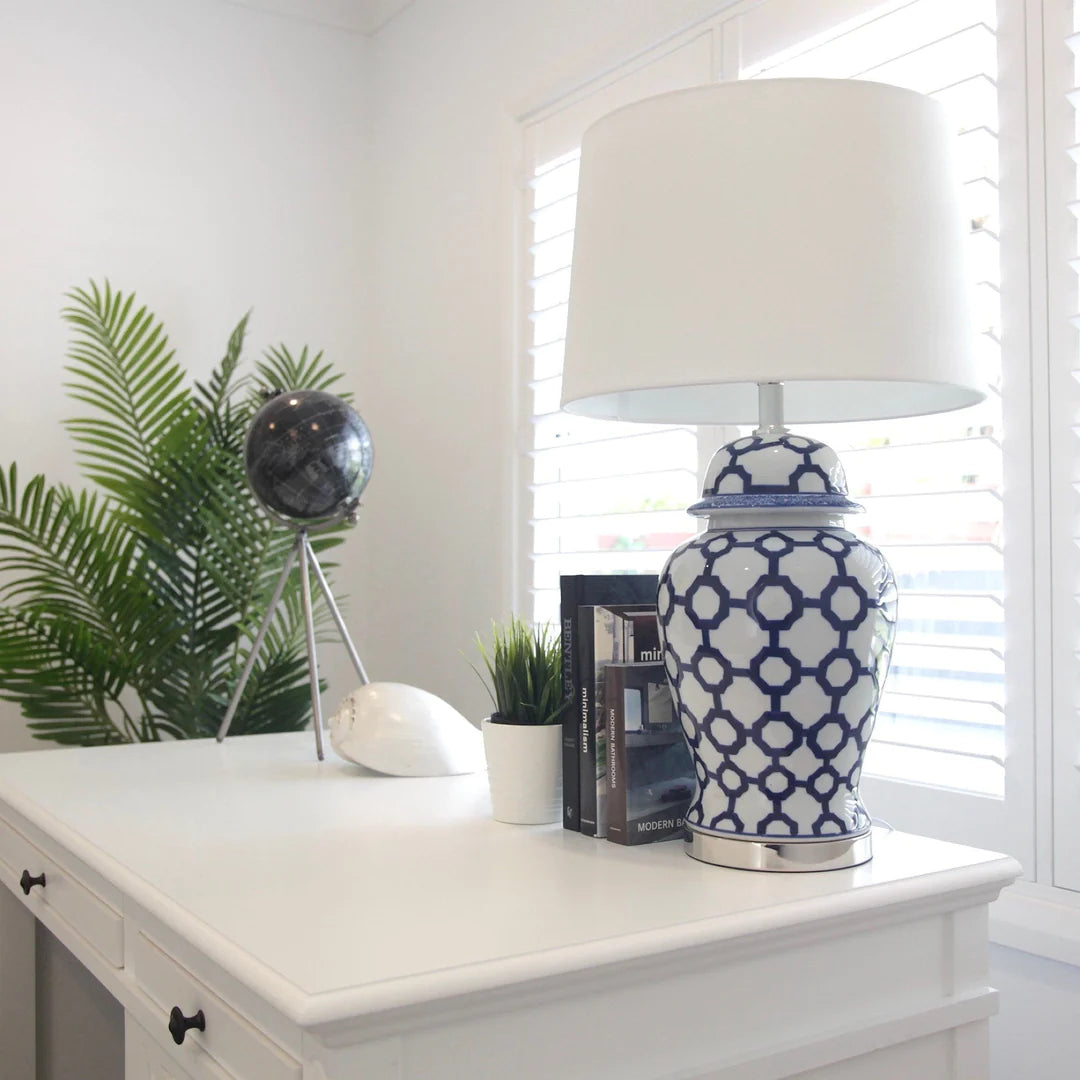 This is a smart and stylish design. Offering a blue and white jar-shaped ceramic base and a plain white shade, this lamp is beautifully balanced. Style in a pair for maximum impact.