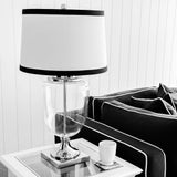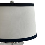 This classic Jessica glass and nickel lamp with white linen shade and black trim is the perfect addition to any room. Its sleek glass base, white linen shade and Hamptons-style navy trim provides a sophisticated aesthetic, while the glass and linen materials offer a modern and sleek look. The combination of matte and polished finishes creates a timeless and sophisticated aesthetic.