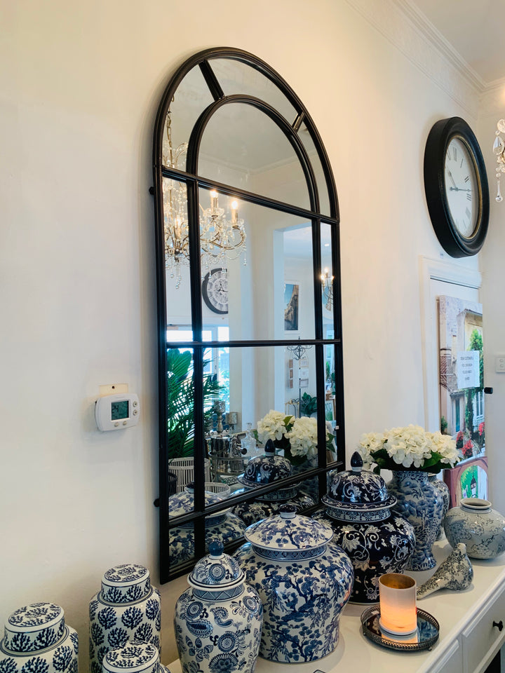 A modern interpretation of a classic style, this arched mirror offers unusual pane detailing. It's tall enough to use as a full length dressing mirror, and would also make a bold statement when displayed as a pair.