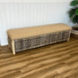 The perfect balance between style and functionality, this wicker bench allows for ample storage and can be used behind sofas or as an end of bed blanket box. Hand crafted with a rattan weave and solid wood frame, this bench is finished with a cushioned top and hessian fabric to allow for comfortable seating. Due to natural the process of this material there will be variations or imperfections in size and colour from one item to the next and each may differ from the photographed sample. Care Instructions: Wipe clean with a soft damp cloth. Indoor use only.